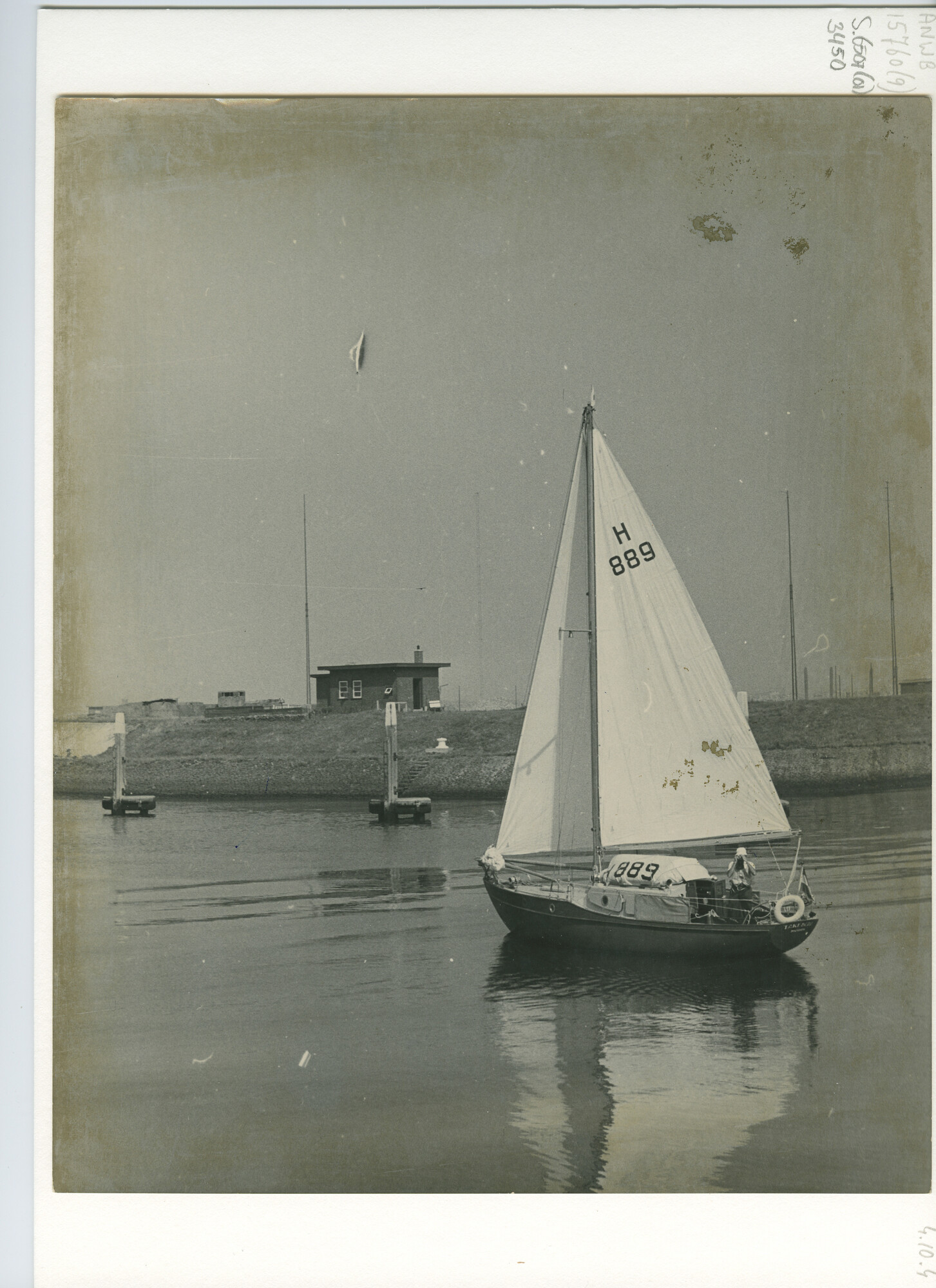 Zijaanzicht over bakboord van het zeegaande polyester bakdek kajuitzeiljacht Takebora, type Oranjebloesem, zeilnummer H889 zeilend bij kalm weer onder grootzeil en fok nabij een dijklichaam met antenne masten. In de kuip met witte zeilhoed de eigenaar Hans Maurenbrecher.